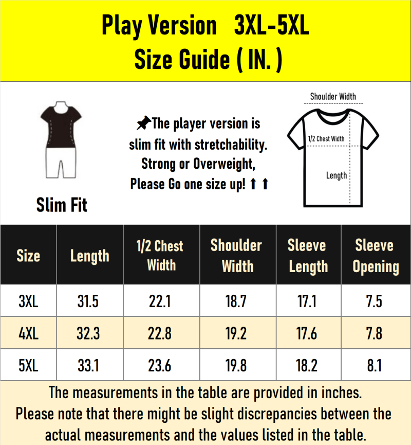 📌Player version jerseys have a slim fit with stretchability. Please note that actual sizes may run slightly smaller, so we recommend buying ONE size larger for the best fit. ⬆ ⬆ strong or overweight, go up TWO size!